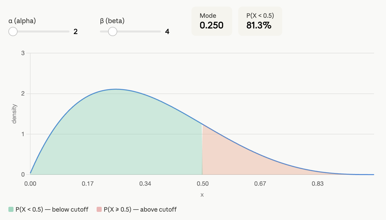 The Bayesian "magic" consists in translating this prior belief that we are 80% sure that the prevalence of diabetes is below 50% into something mathematical. Without getting too technical, I can translate our assumption into a Beta distribution, Beta(2, 4). Under this assumption, we are 81.4% sure that the prevalence of diabetes is below 50%: